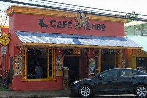 Paia (pronounced pa-ee-uh) is a fun little town on the north side of Maui – sort of a cross between New Age and Hippie. Very popular with both locals and visitors, Paia has a number of small restaurants and Cafe Mambo is one of our favorites. It’s easy to find – there are only two main streets in Paia. Located at 30 Baldwin Avenue, Cafe Mambo is a short walk from the town’s one and only stop light.