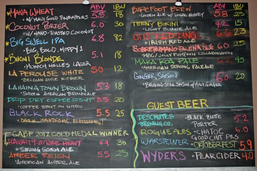 The ABV column in this list is alcohol by volume – a pretty objective measure. The IBU column stands for International Bittering Units – a more subjective measure of the effect of hops on beer taste. You can see the brewing vats in action. It’s very casual with lots of TV’s, all playing sports. The food is decent pub grub with efforts toward a Hawaiian twist. We enjoy the variety of sliders at just $4 or $5 each. A slider or two, a side of fries and a home-style brew is well worth our drive from Kihei to Kahana. In fact, we wear our Maui Brewing logo shirts on Wednesdays and get a $3 pint!