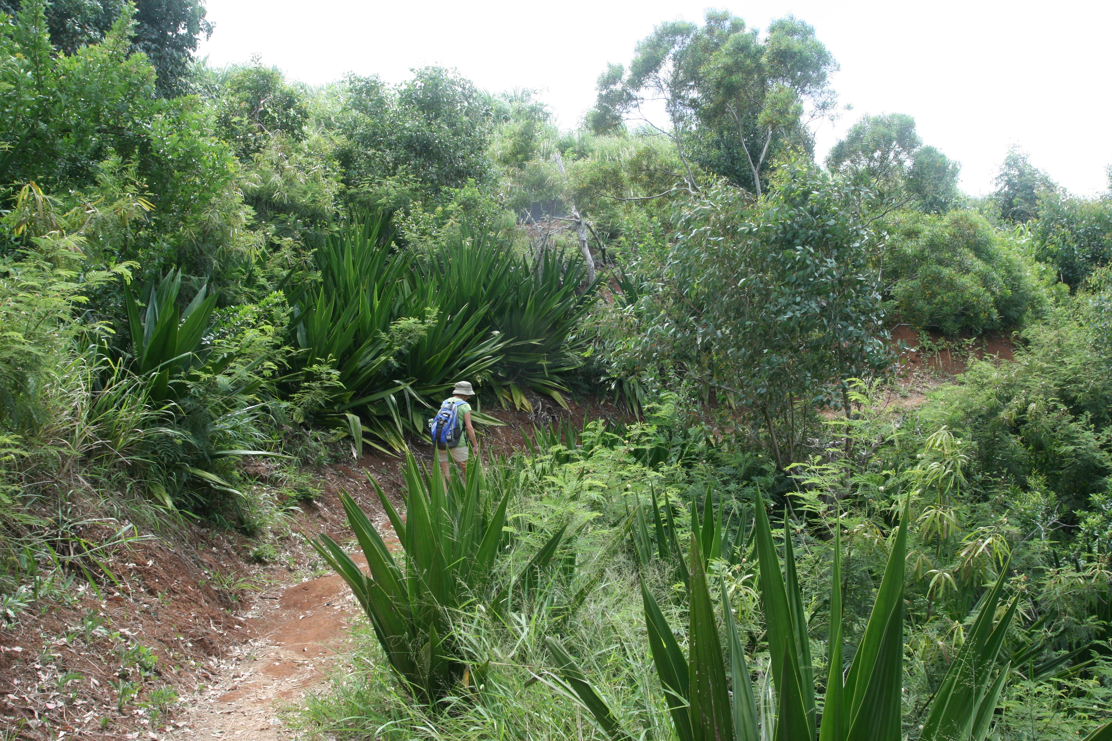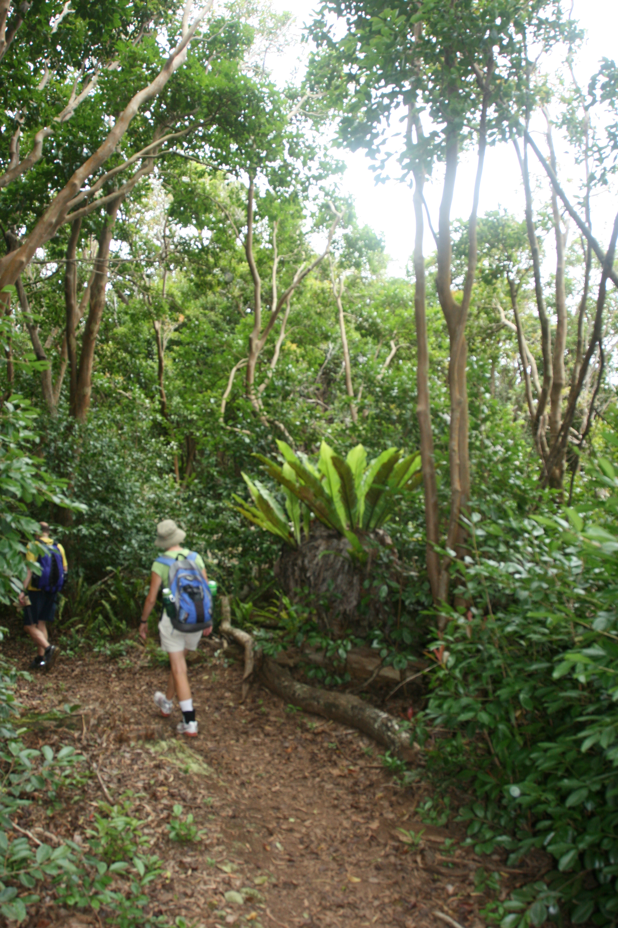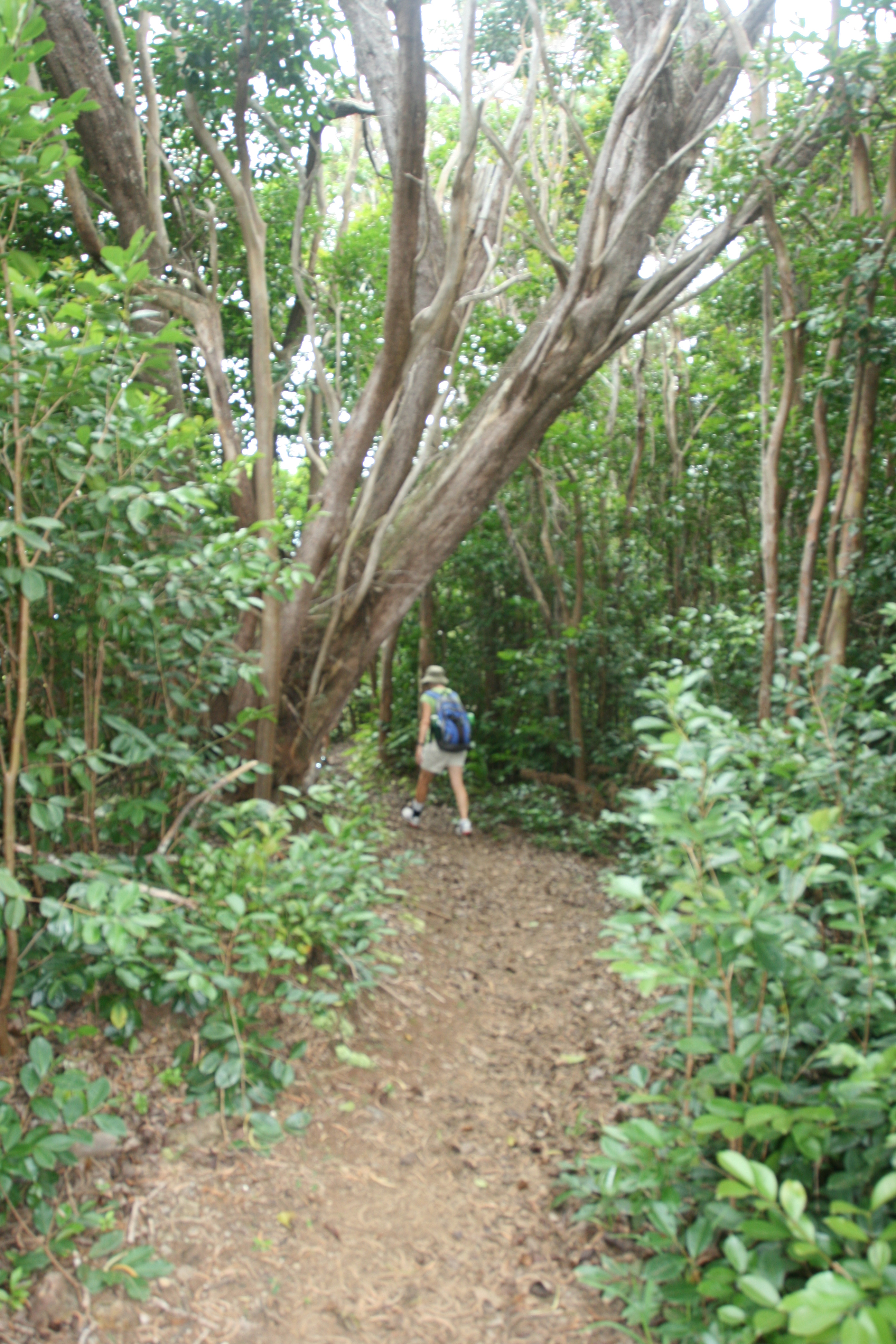 Walk under the shade trees on the makai side of the boat ramp parking lot. Cross the boat ramp and look for the path just to the right of the paved driveway with the “Do Not Enter” sign.