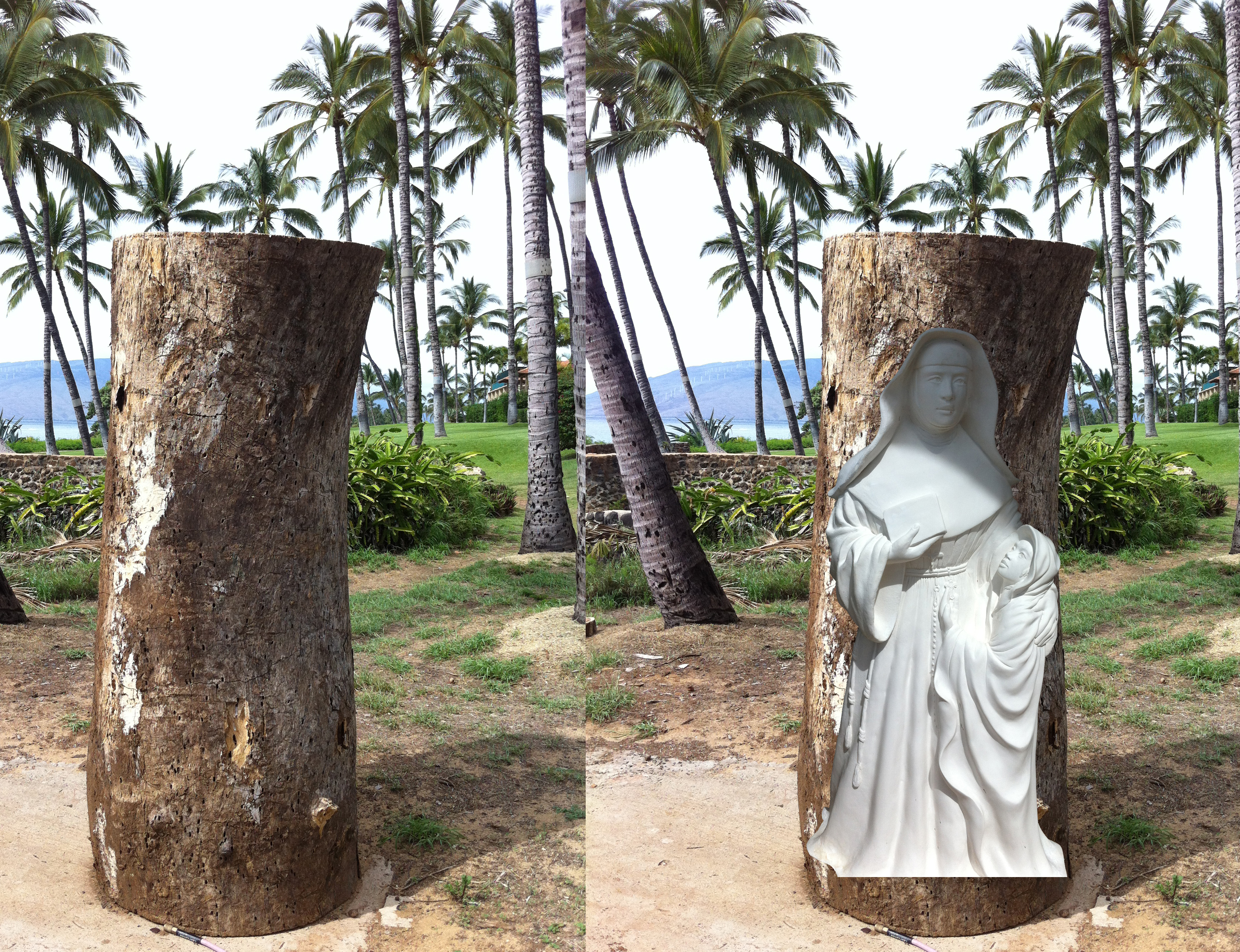 On the left is the Monkey Pod tree trunk that will become Dale’s next statue. The image on the right shows Dale’s plaster study for Saint Marianne superimposed over the tree trunk. The half-size plaster study is enlarged here to give an idea of what will emerge from the wood.