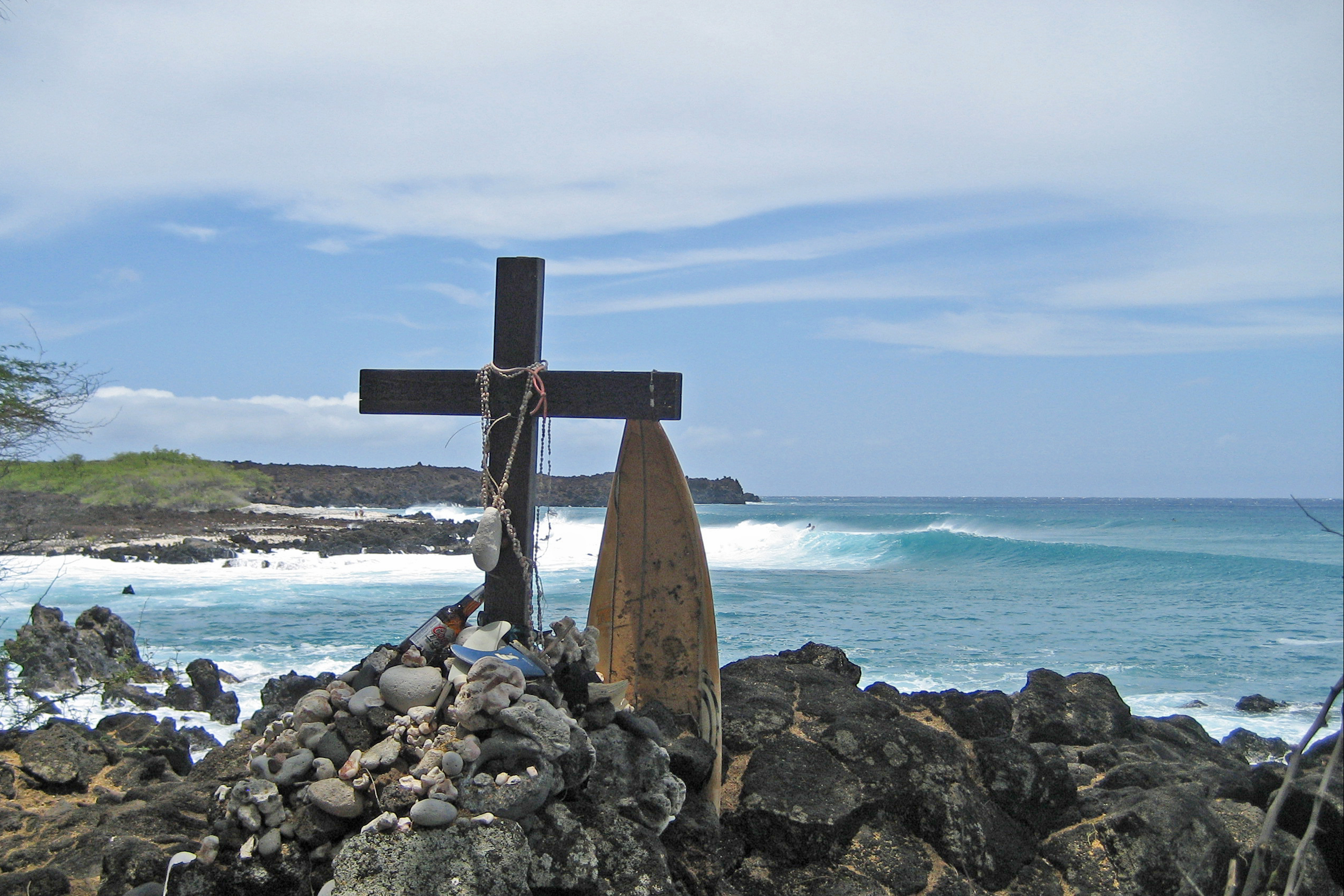 A pretty bay greats you at the end of the lava field. After that you walk under the welcome shade of mesquite trees (locally known as kiawe). Lots of feral goats here. Keep a lookout for a surfer memorial on your right after you’ve walked for 5 or 10 minutes.